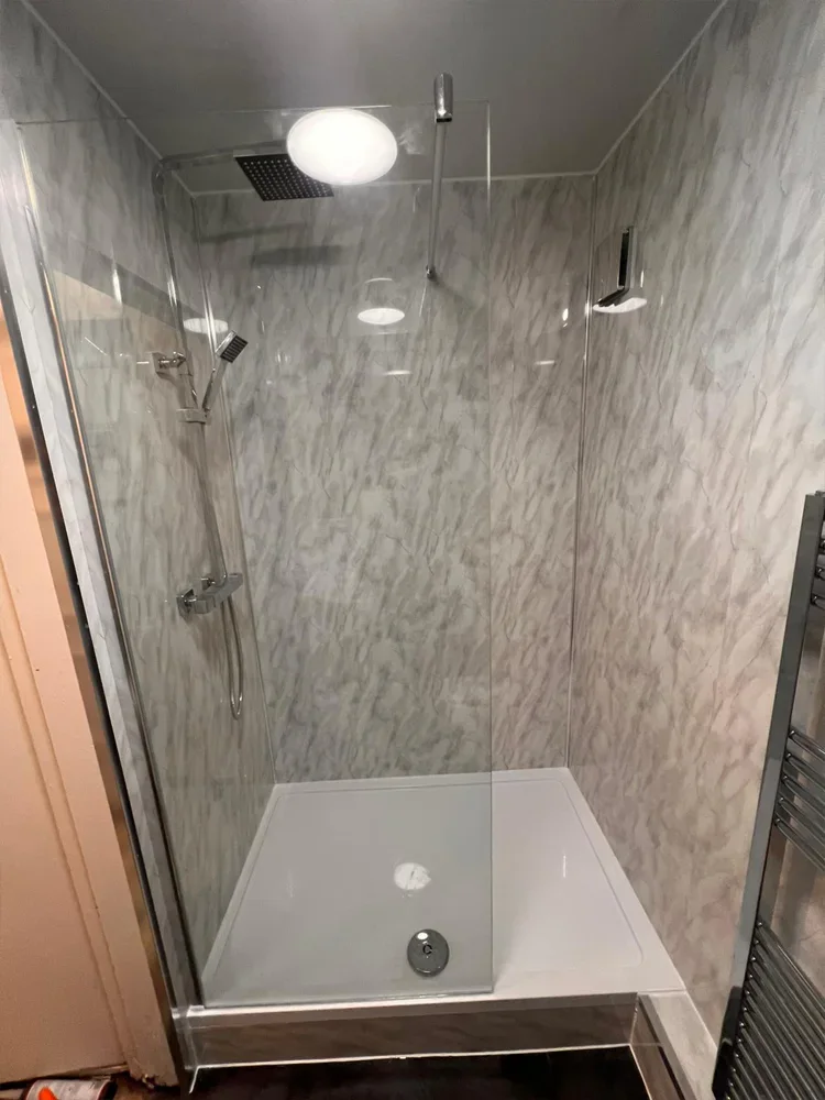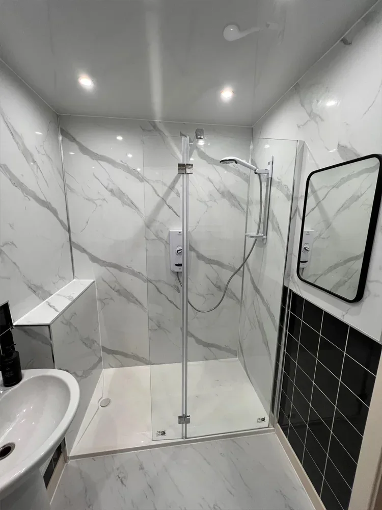 Costs vary depending on the size and specification. A basic refit typically starts from £3,500–£5,500, while a luxury bathroom with walk-in shower and premium finishes can range from £6,000–£12,000+. We provide a detailed, no-obligation quote after a free site survey.
